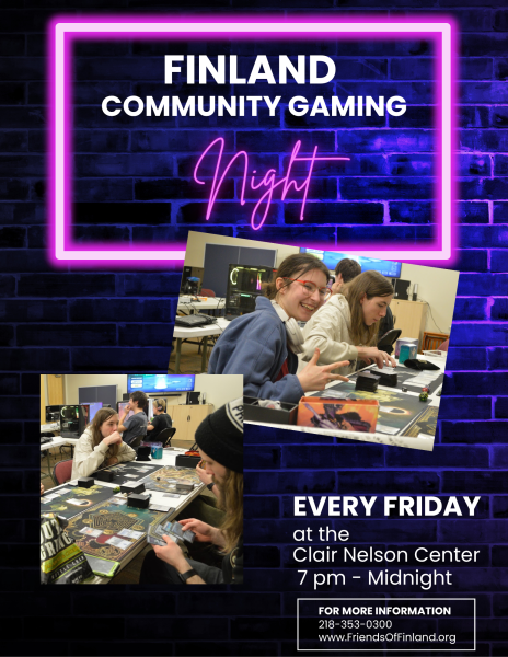 Friday Finland Community Gaming Night is a fun opportunity for locals (ages 12+) to come together to play games at the Clair Nelson Community Center.
